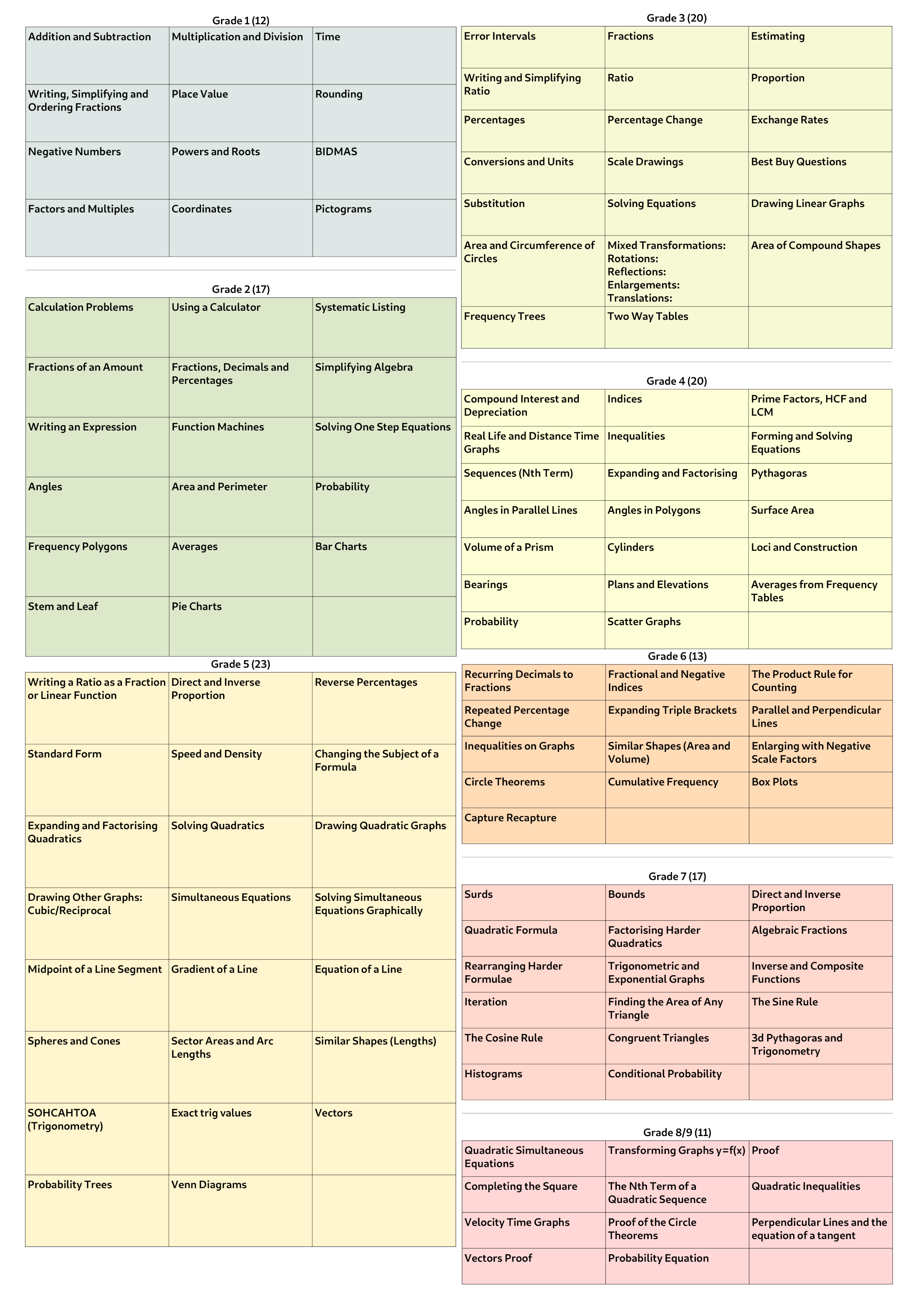 Volume of prisms, mixing densities and bounds. Two-way tables & frequency trees, quadratic sequences, transforming graphs, compisite and inverse functions.